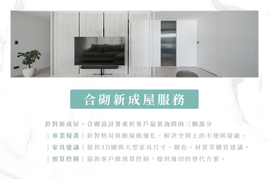 合砌設計為依法設立的公司,成立至今已有5年以上。我們選用品質較佳的五金做標配,並提供2年的保固。我們承接過不少新成屋的案件,針對新成屋,我們將重點放在以下三個部分: