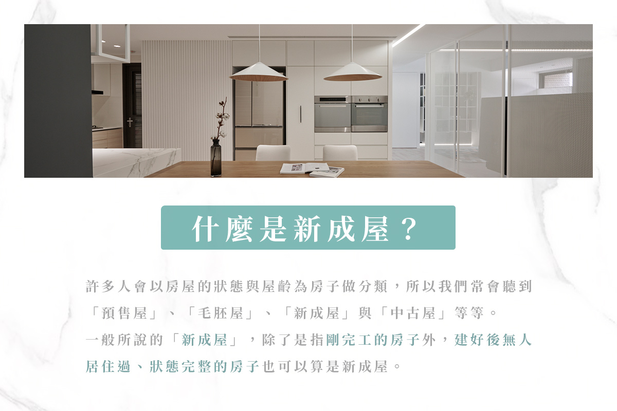 一般所說的「新成屋」,除了是指剛完工好的房子外,建好後無人居住過、狀態完整的房子也可以算是新成屋。